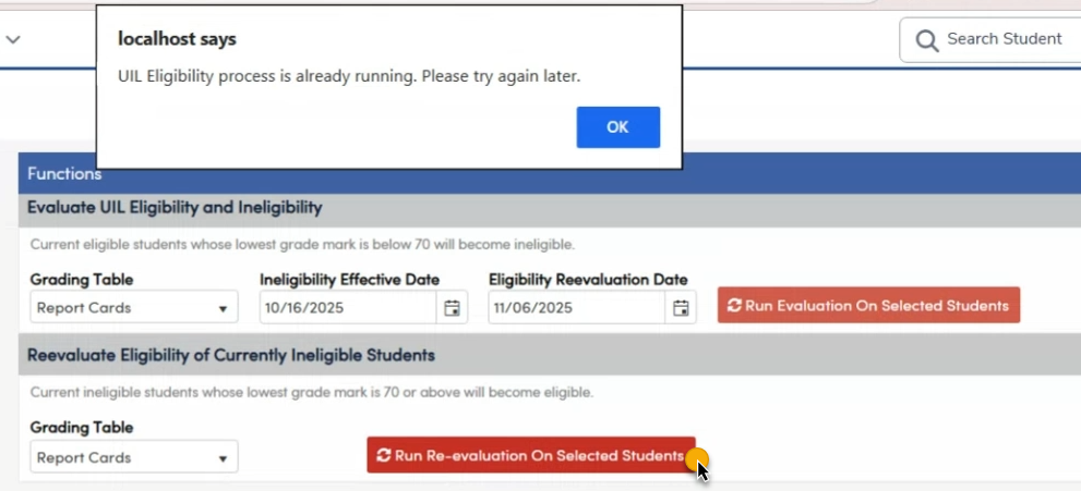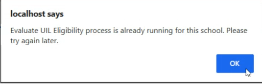 "Evaluate UIL Eligibility process is already running for this school. Please try again later."