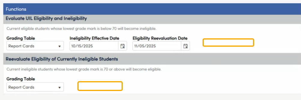 - Student Data > Other > UIL Eligibility Manager - Evaluate student grades and update eligibility status for a group of students.