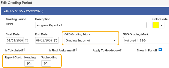 • Grading Snapshot - Select this option to indicate that the grading period is used as a Grading Snapshot only. Grading Snapshots can be used for mid-term progress reporting or to determine sports eligibility. See Grading Snapshots - Overview and Configuration. The Show in Portal field is only displayed if this option is selected.