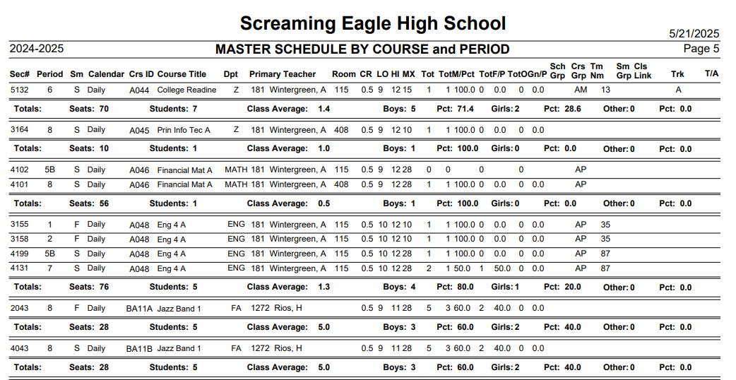 The following example is printed from the Print Master Schedule report, by Course and Period: