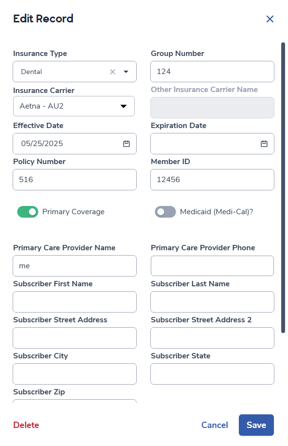 A window will display with several fields to store Insurance information, subcriber information and effective dates.