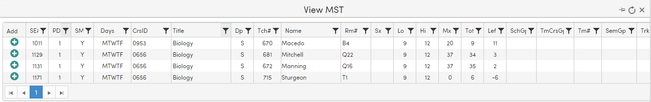 Click Filter and the View MST list will only display first period sections of courses that contain "bio" in their course titles:
