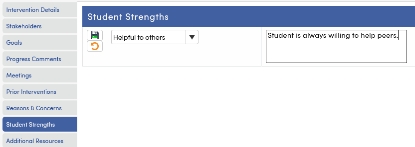 The Intervention page has the ability to add Student Strength information to the Intervention record.
