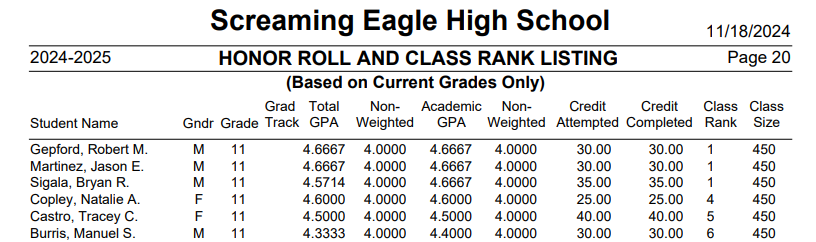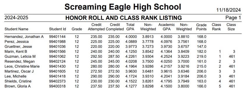 The following is an example of the Honor Roll and Class Rank Listing from Grade Reporting report.