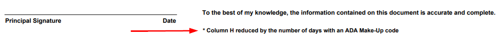 The report includes an asterisk next to Column H indicating it has been reduced by the number of days with an ADA Make-Up code: