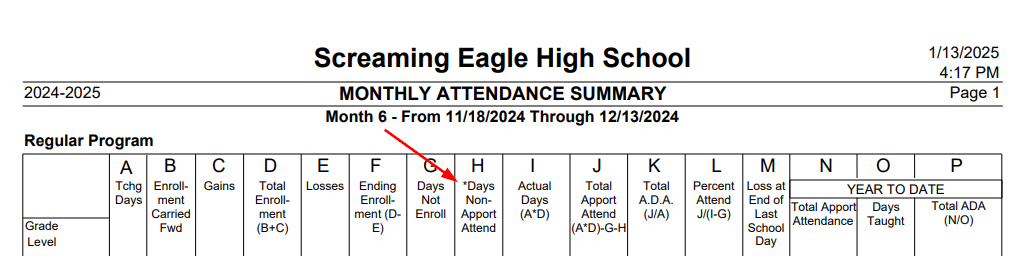 • (H) Days Non-Apportionment Attendance - Total number of absences.