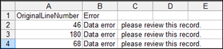 - Special_Ed_Students_Errors.csv – if the header record has missing or misnamed key fields (last name, first name, student ID or SSID) they will be listed and the import process will stop. The headers will need to be corrected before the file can be imported. If the header record has missing or misnamed non-key fields processing will continue, but a record will be added to the Errors file with the incorrect field name(s). Data will not be updated for fields with incorrect field names. For files with a correct header this report will also list any records that were not processed because of an error. These records will need to be checked and the error resolved. The OriginalLineNumber is the record number in the Student file.
