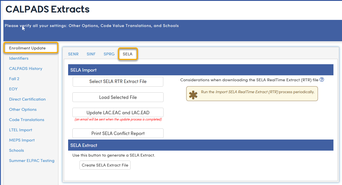 Note: The SELA Import should be run at the beginning of the school year before uploading the first SELA file for the year to CALPADS and periodically throughout the year. This will ensure that all students in your database have the most recent CALPADS Student Language Acquisition Status (ELAS) information.