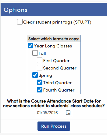 If there are already MST records in the school, a new option will display to Select the terms to copy. By default, past and current terms will be unchecked in the new Terms option