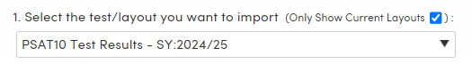 Select the proper school year file layout to import the PSAT 10/NMSQT Test Results data file. When deciding which year file layout to use, first select the file layout that was in effect when the data was downloaded. If the data does not import using that file layout, then try using the file layout for the year the assessment was administered.
