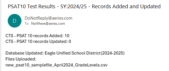 The PSAT Test Results import will add/update records to the College Entrance Test (CTS), table. After the import process has completed an email with summary information will be sent to the user that initiated the import.