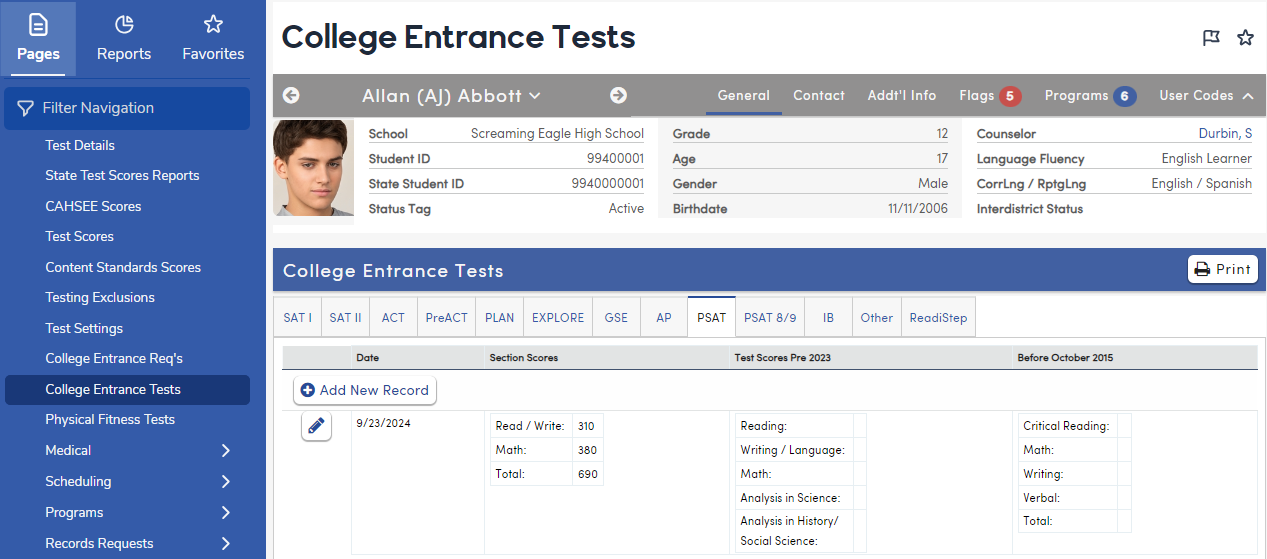 The PSAT test results can be viewed in the PSAT tab of the College Entrance Tests page.