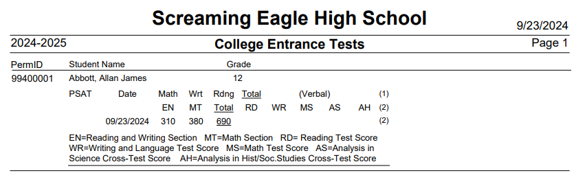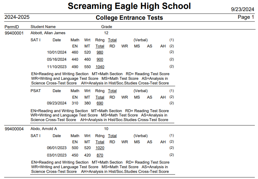 The same report can be run for all students in a school from View All Reports | College Entrance Tests. This report is only available at the School level, it cannot be run from the District.
