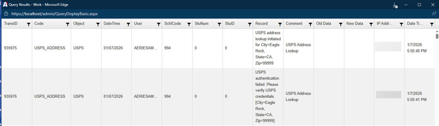 Aeries has a feature to lookup the ZIP+4 code from the USPS when entering or changing a student's address. This feature requires the district to register for a free USPS Developer Portal account at https://developers.usps.com/getting-started.