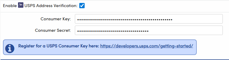 - Enter the Consumer Key and Consumer Secret you received when registering for the USPS Developer Portal.