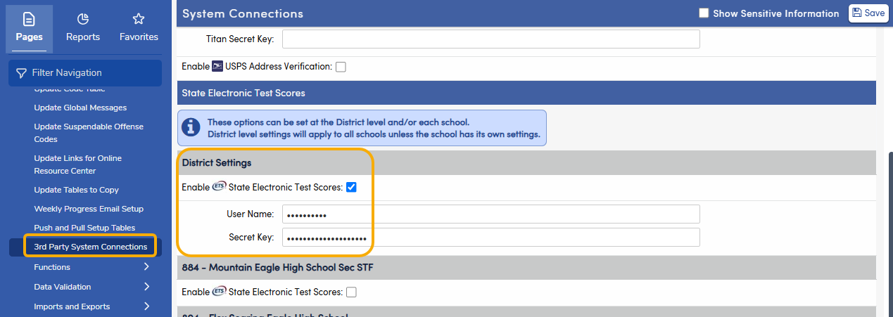 From the 3rd Party System Connections page click on the Enable State Electronic Test Scores option. This will open up access to enter the User Name and Secret Key. To unmask the User Name and Secret Key click on the Show Sensitive Information in the blue header at the top of the page. Click on the Save button at the top of the page to save the changes.