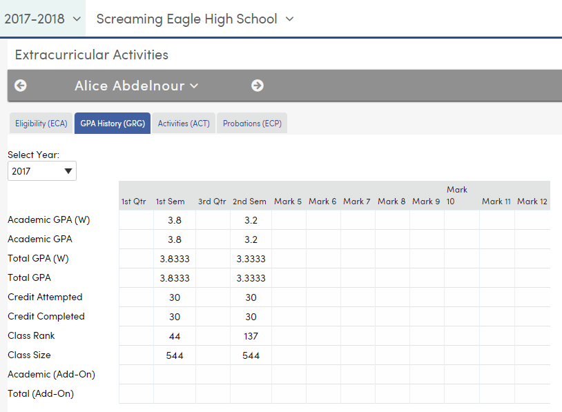 Prior years can be selected from the Select Year dropdown and the GPA’s that are stored in the GRG table for that year will display.