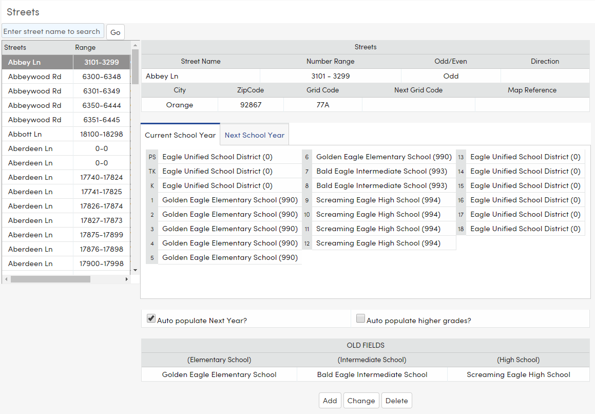 The Street table will also store the School that a student should be enrolled in according to the street location for each grade level in the current year as well as the next school year. Grades 13-18 can also be populated for the current year or the next year.