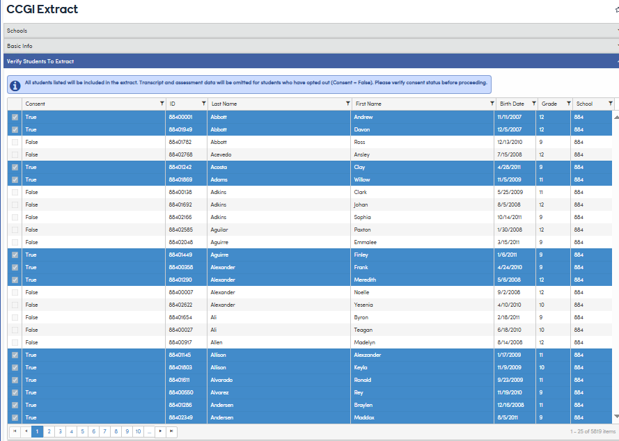 All students in the list will be included in the StudentTemplate extract regardless of the value in the Consent column. However, only students with a check will have transcript records included in the CourseGradeTemplate or test scores included in the TestTemplate.