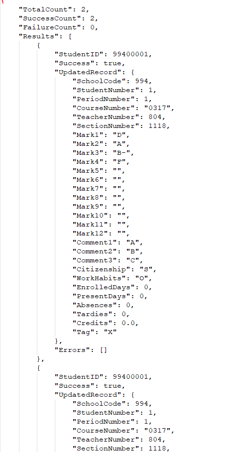 - This end point allows POST to the following fields only for records that already existing in the Grades (GRD) table: