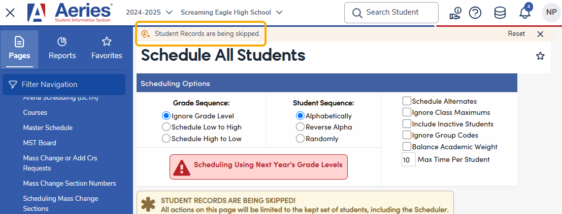 If you'd like to schedule a specific group of students, a KEEP or SKIP statement can be run in Query. Once the KEEP or SKIP is run, a Stu Records are being skipped message will display at the top and another warning will appear on the Schedule All Students page.