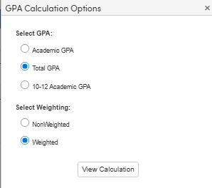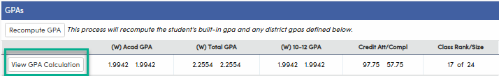 Select the View Calculation button next to the custom District GPA to view how that GPA was last calculated: