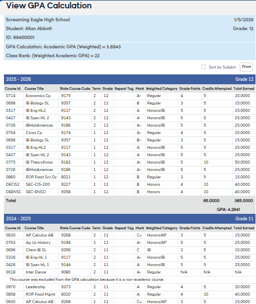 All courses completed in grades 9–12, as well as any grade 7–8 courses identified as Off Grade Courses, are included in the GPA calculation. If a course is excluded, a reason for the exclusion is displayed.