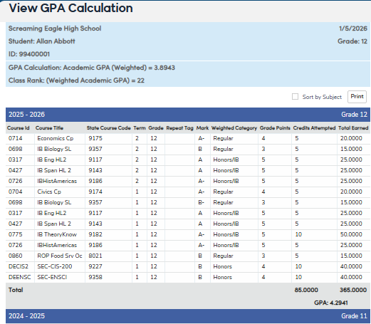The View GPA Calculation page and the GPA Calculations Report are available from the school level and display all information used to determine each student’s GPA when a record exists in either the Built‑in GPA (BGV) table or a custom District GPA (DGV) table.