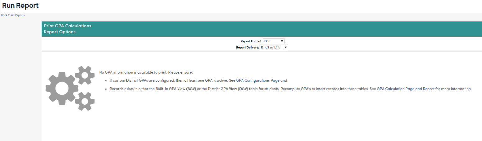 If their are no records in the Built-in GPA (BGV) table for this school, you will see the following message with instructions on how to ensure the GPA calculation details are available.