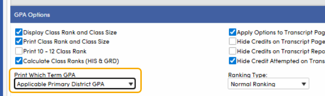 - Print a student's Transcript with a Transcript Definition GPA Option Print Which Term GPA set to Applicable Primary District GPA (District GPAs only)