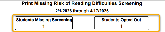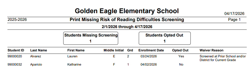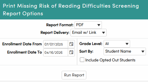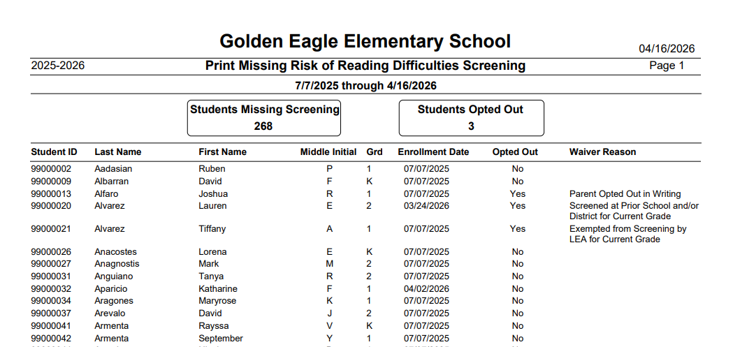 The Print Missing Risk of Reading Difficulties Screening report identifies students who are enrolled at a California school and have not yet received a required reading difficulties screening for their currently enrolled grade. It is intended to help administrators monitor compliance and take timely action to ensure students are screened annually.