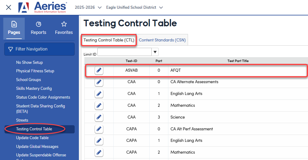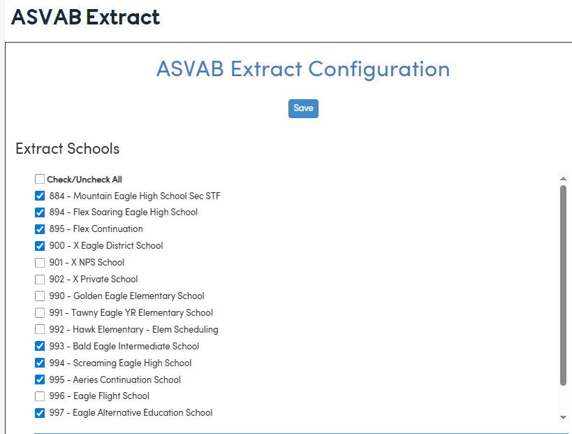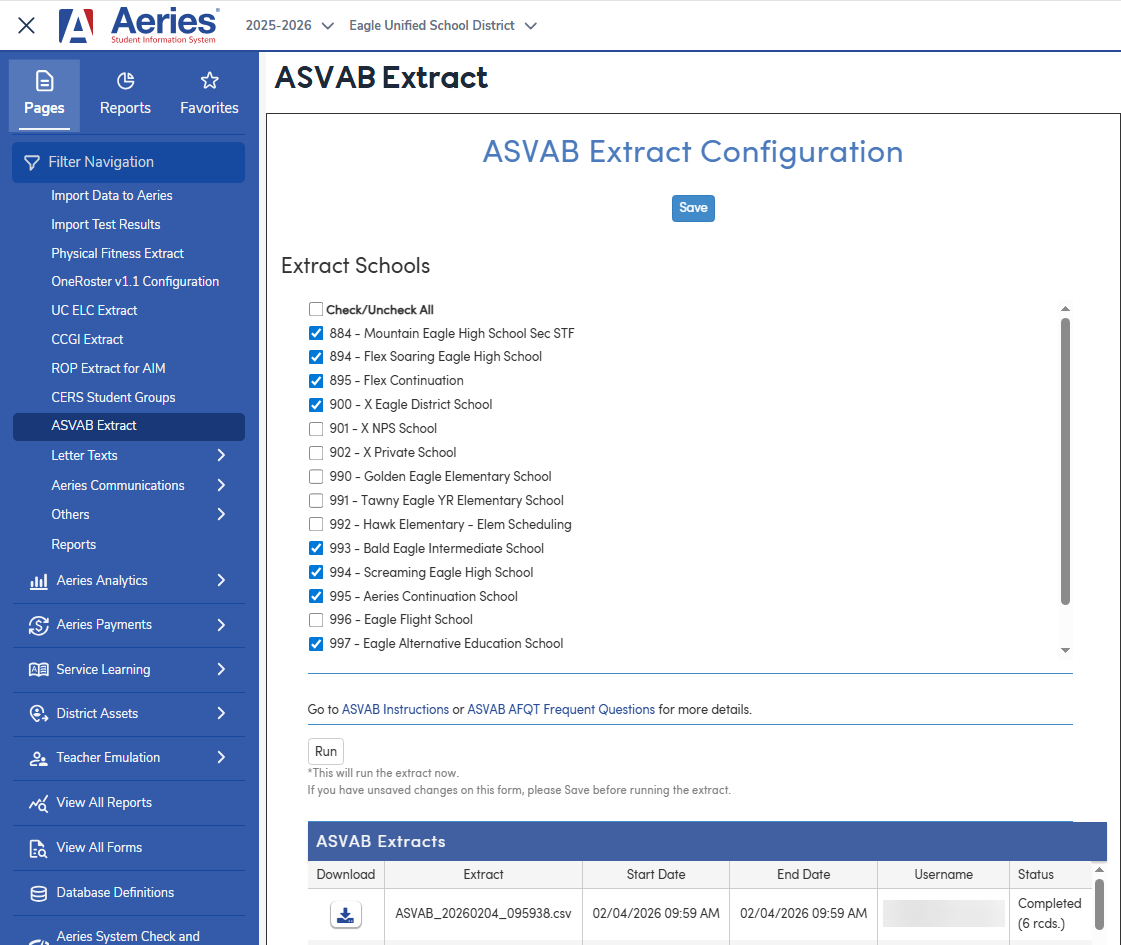 Aeries provides an extract that compiles the highest AFQT score for eligible students into a districtwide file for submission to the California Department of Education (CDE) as part of the ASVAB data collection process.