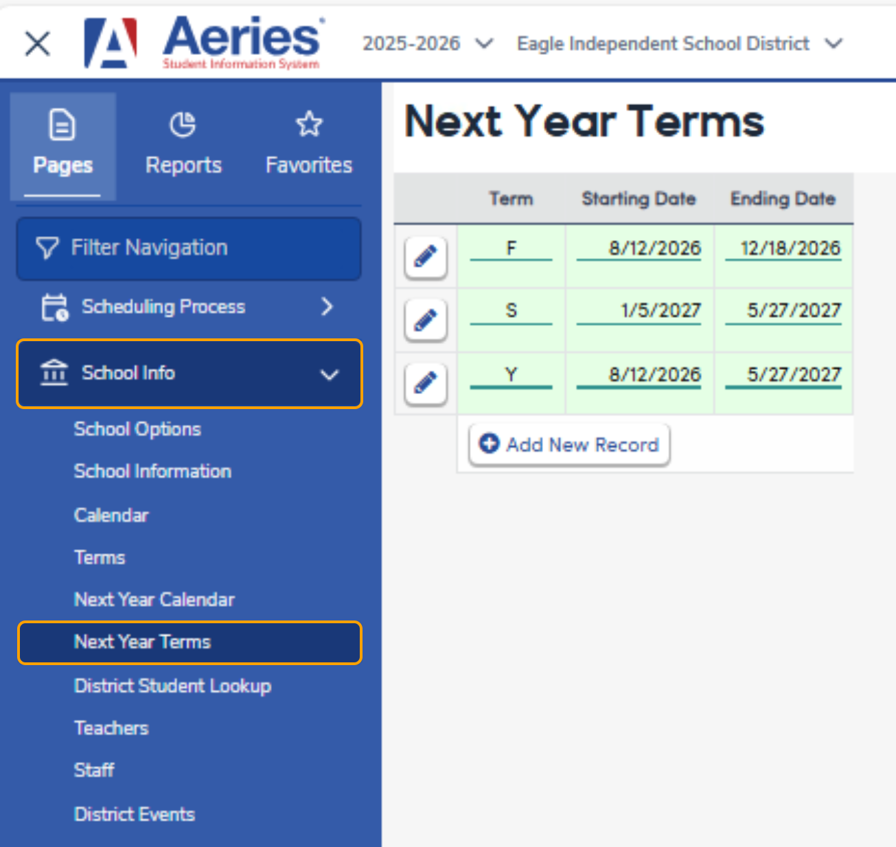 The Next Year Terms page allows districts and schools to define school terms for the upcoming school year before rollover. This page functions the same as the Terms page, but stores data for the next school year so it can be copied into the active year during rollover.
